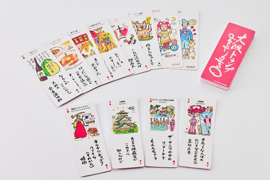 大阪トランプには、話題のお店や、名所が、クスっと笑える大阪弁が描かれています。カードゲームはもちろんガイドブックとしても、芸術作品としても価値あるトランプです。